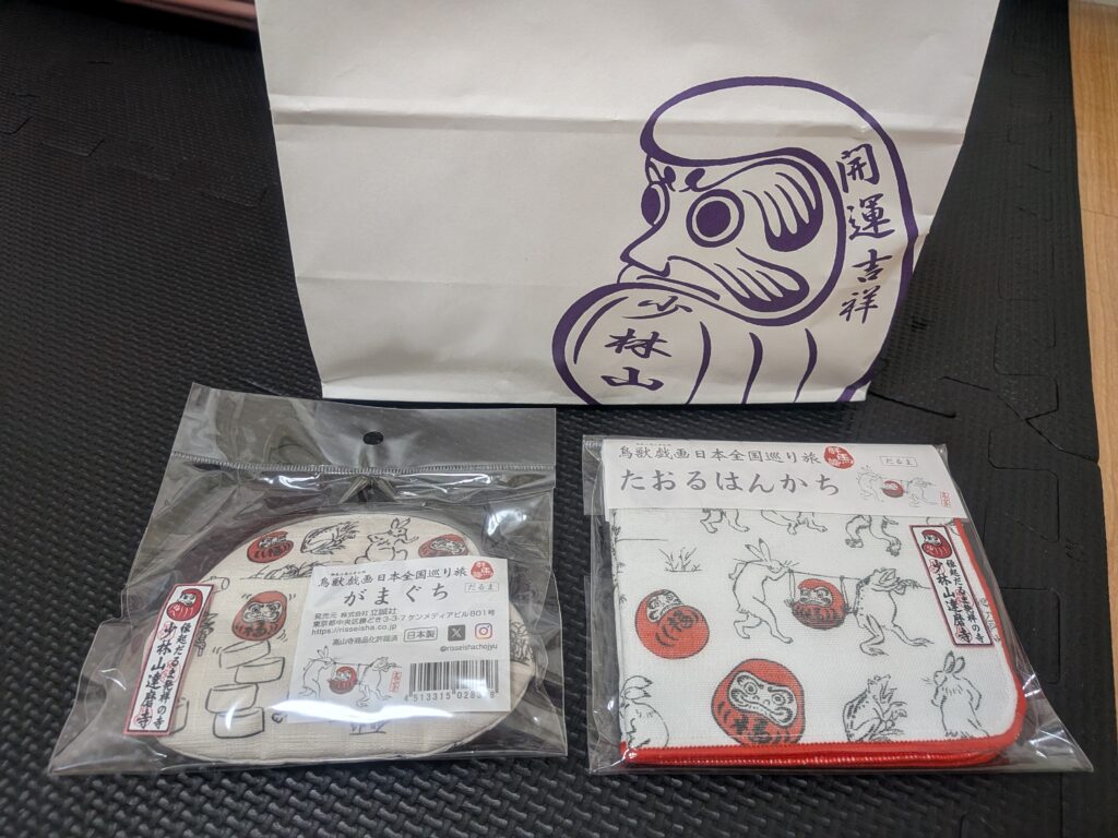 階段を降り、少林山の店頭販売に向かうと・・・鳥獣戯画の達磨コラボ商品が陳列されてました!